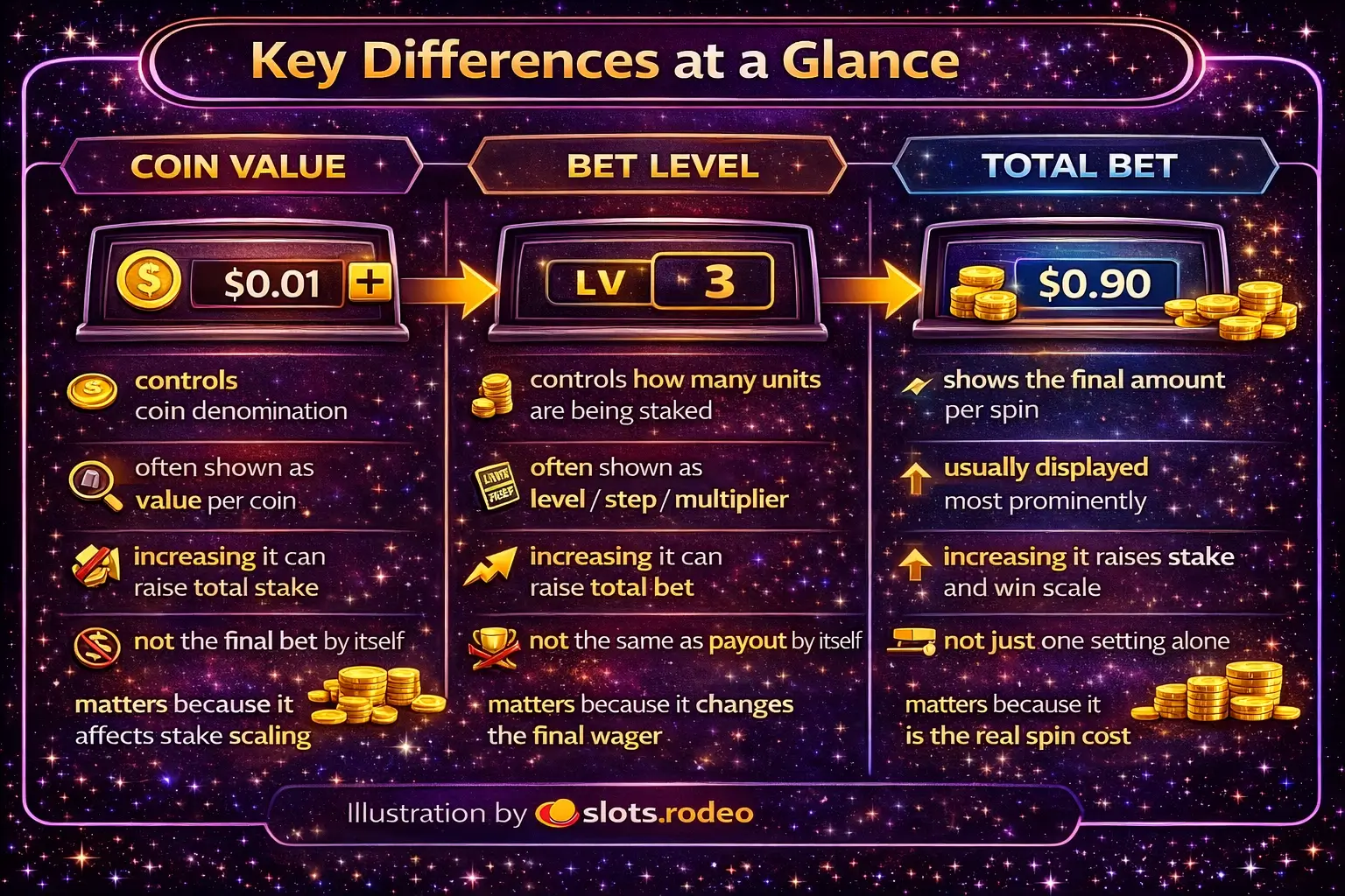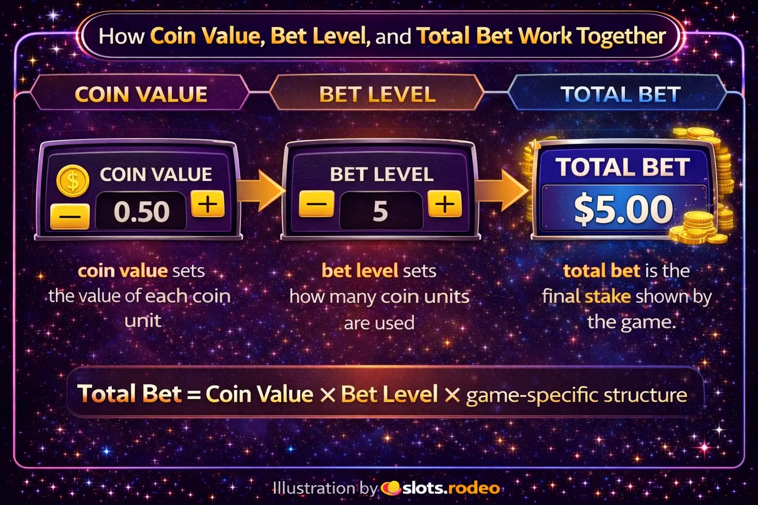 Coin value and bet level contribute to determining the stake. Total bet reveals the actual expenditure.