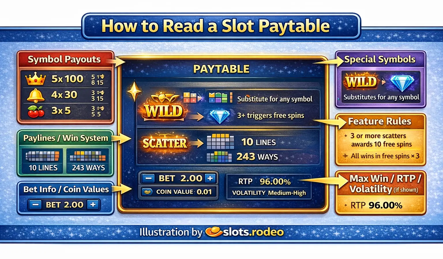 Learn how to read a slot paytable step by step. Understand symbol values, payout rules, wilds, scatters, bonus features, bet sizes, and what to check before you play.