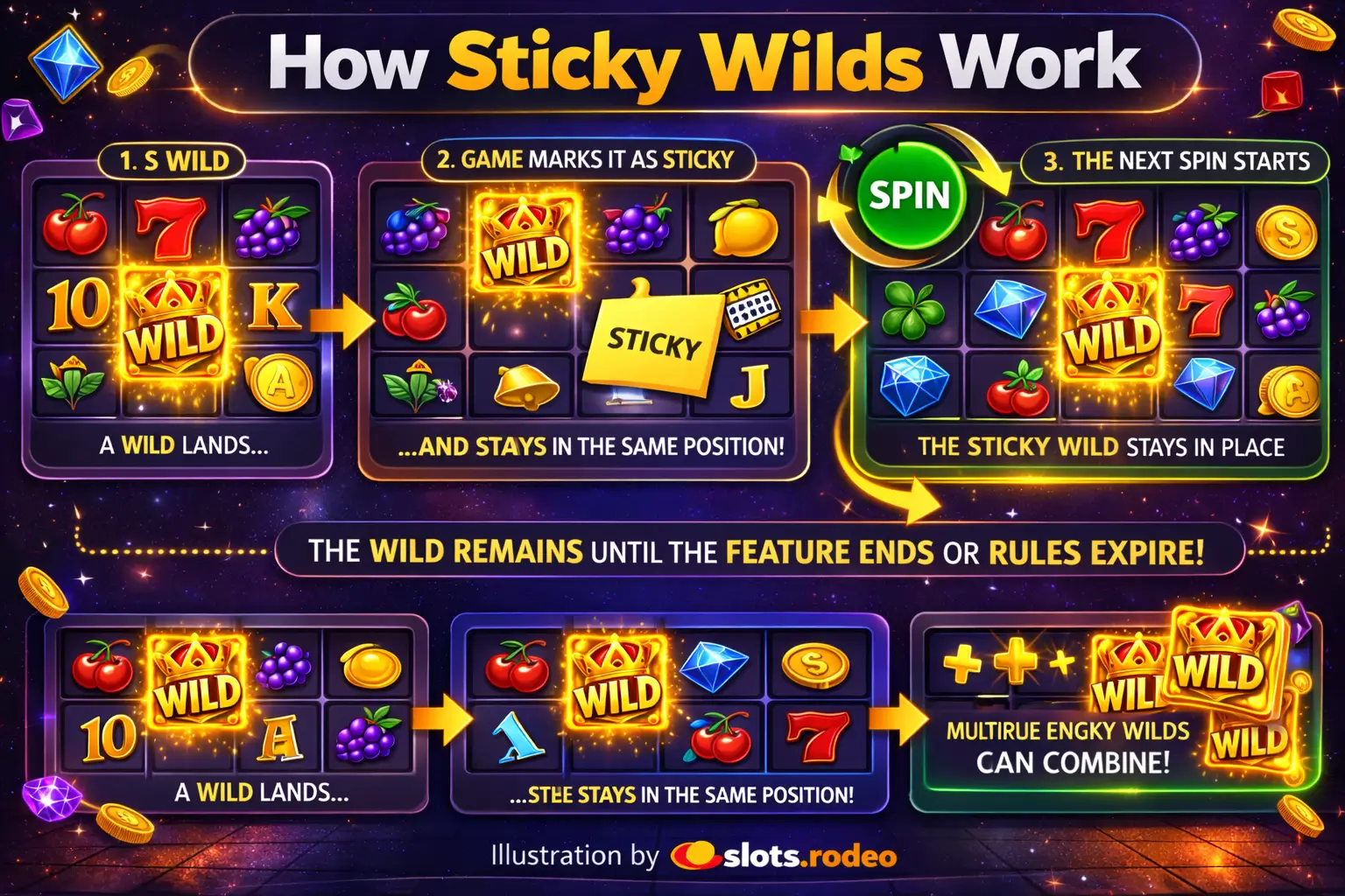 Discover the concept of sticky wilds in slots, how they persist during spins or bonus rounds, and the distinctions between them, regular wilds, and expanding wilds.