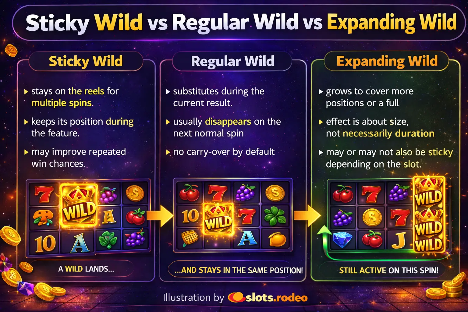 Comparison of sticky wild, regular wild, and expanding wild in slots