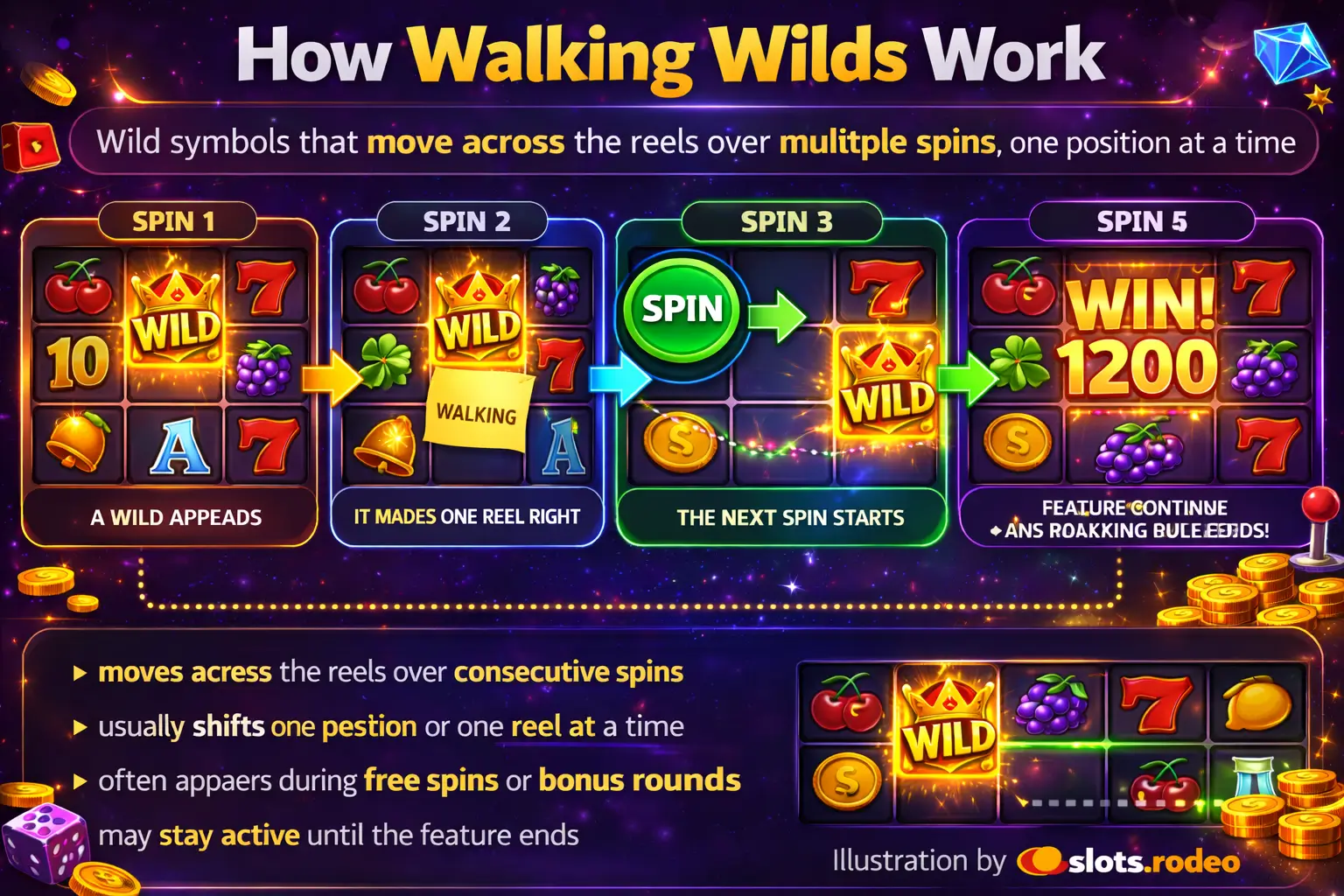 Awalking wildis a wild symbol that does not stay fixed in one position. Instead, itmoves across the reels or grid over consecutive spins or feature steps.
