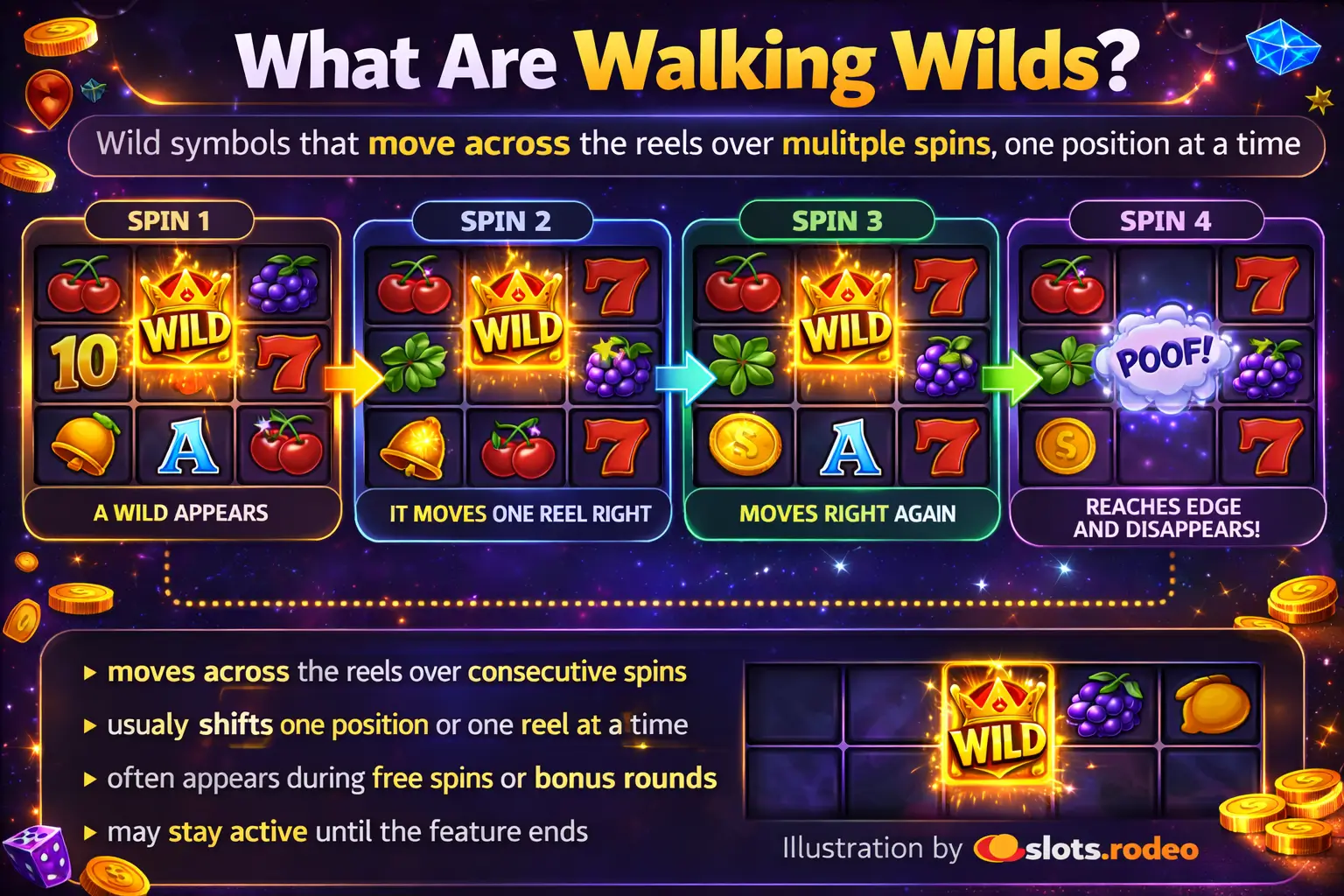 A regular wild usually affects one result and then disappears. A sticky wild stays in one place. A walking wild does something different: itkeeps its presence but changes location.