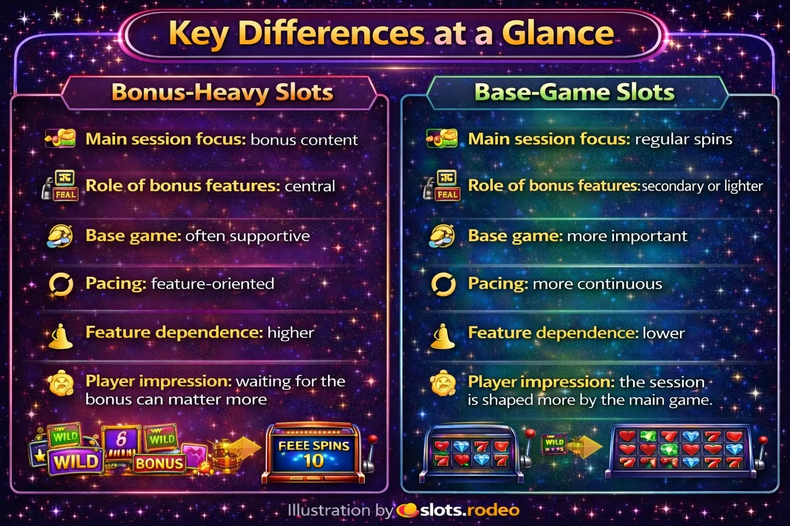ALT:Summary graphic showing the main design differences between bonus-heavy slots and base-game-driven slots