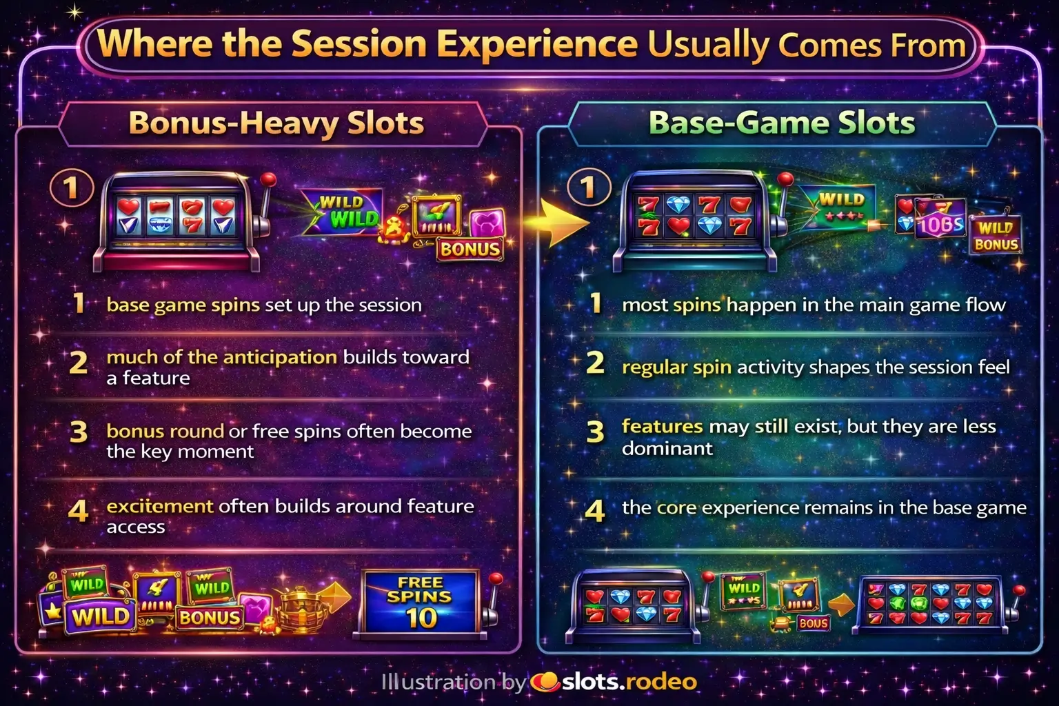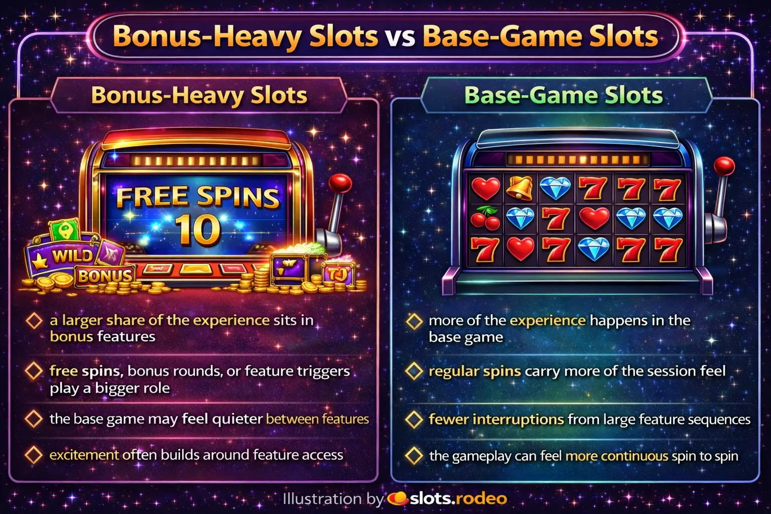 ALT:Comparison illustrating the contrast between bonus-heavy slots and those that maintain more of the experience within the base game.