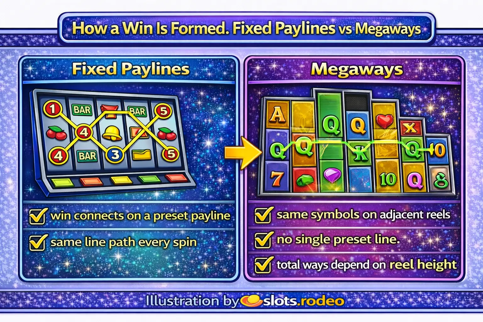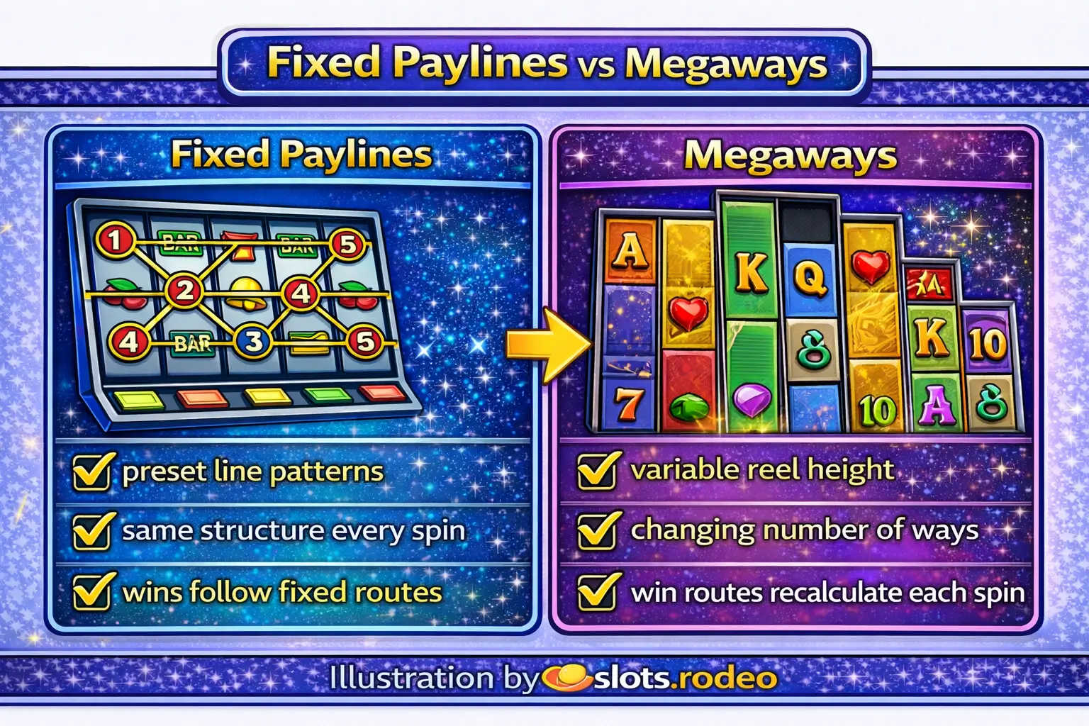 Fixed paylines and Megaways represent two distinct mechanisms for structuring wins in a slot game.