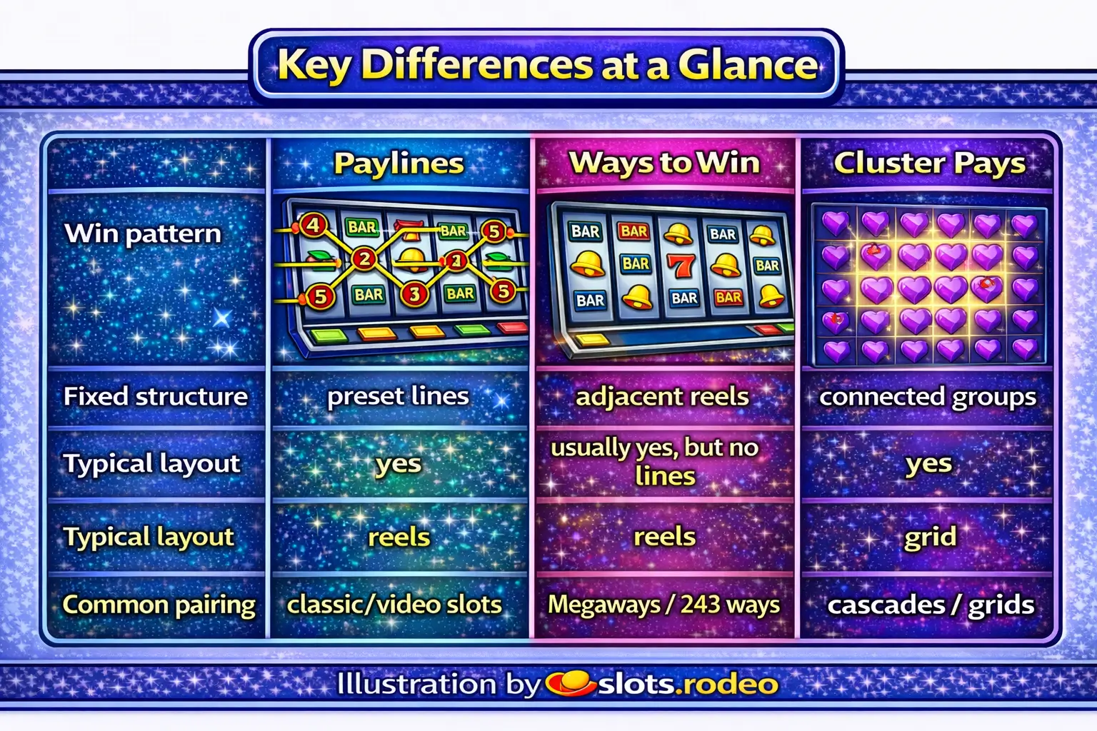 | Feature | Paylines | Ways to Win | Cluster Pays |
