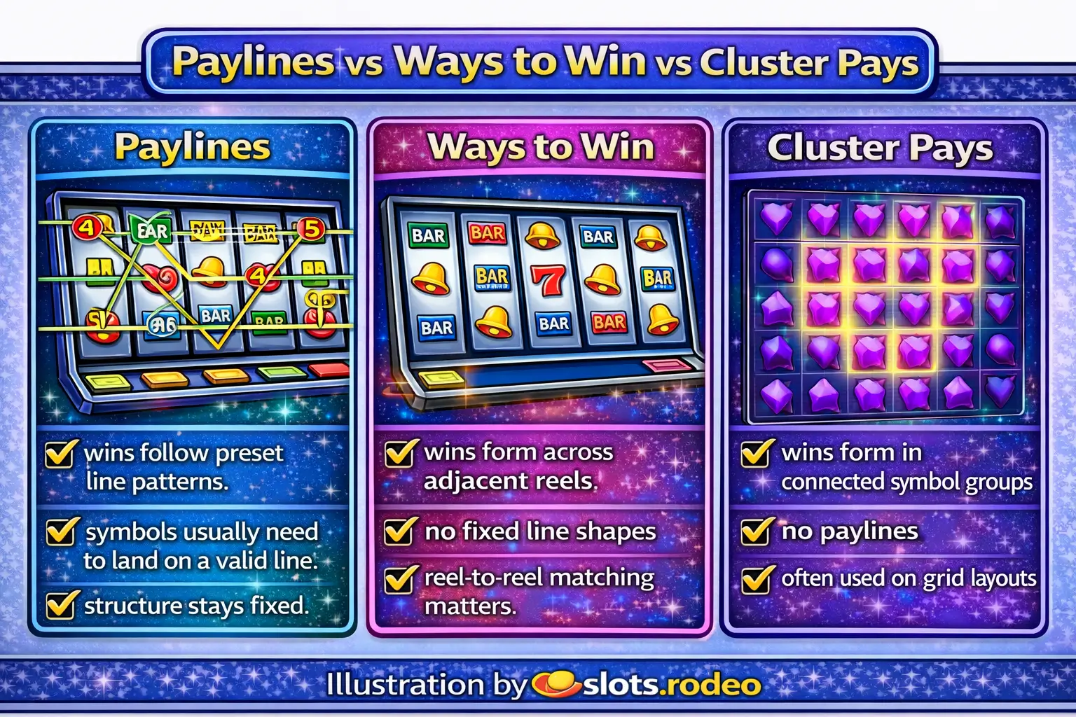 Some slots usepaylineswhere symbols must land on fixed line patterns. Some useways to winwhere matching symbols count across reels without needing a set line. Others usecluster payswhere wins come from groups of touching symbols.