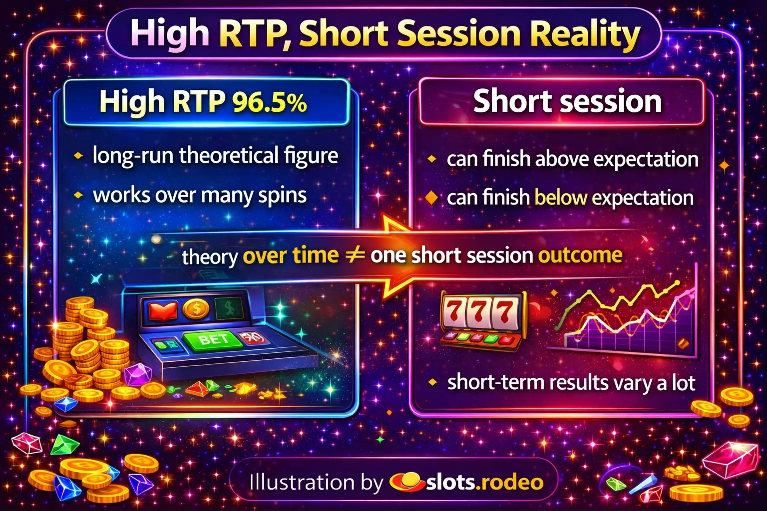 Learn why a high slot RTP does not guarantee better short-session results. Understand the gap between long-run theory, volatility, and real short-term outcomes.