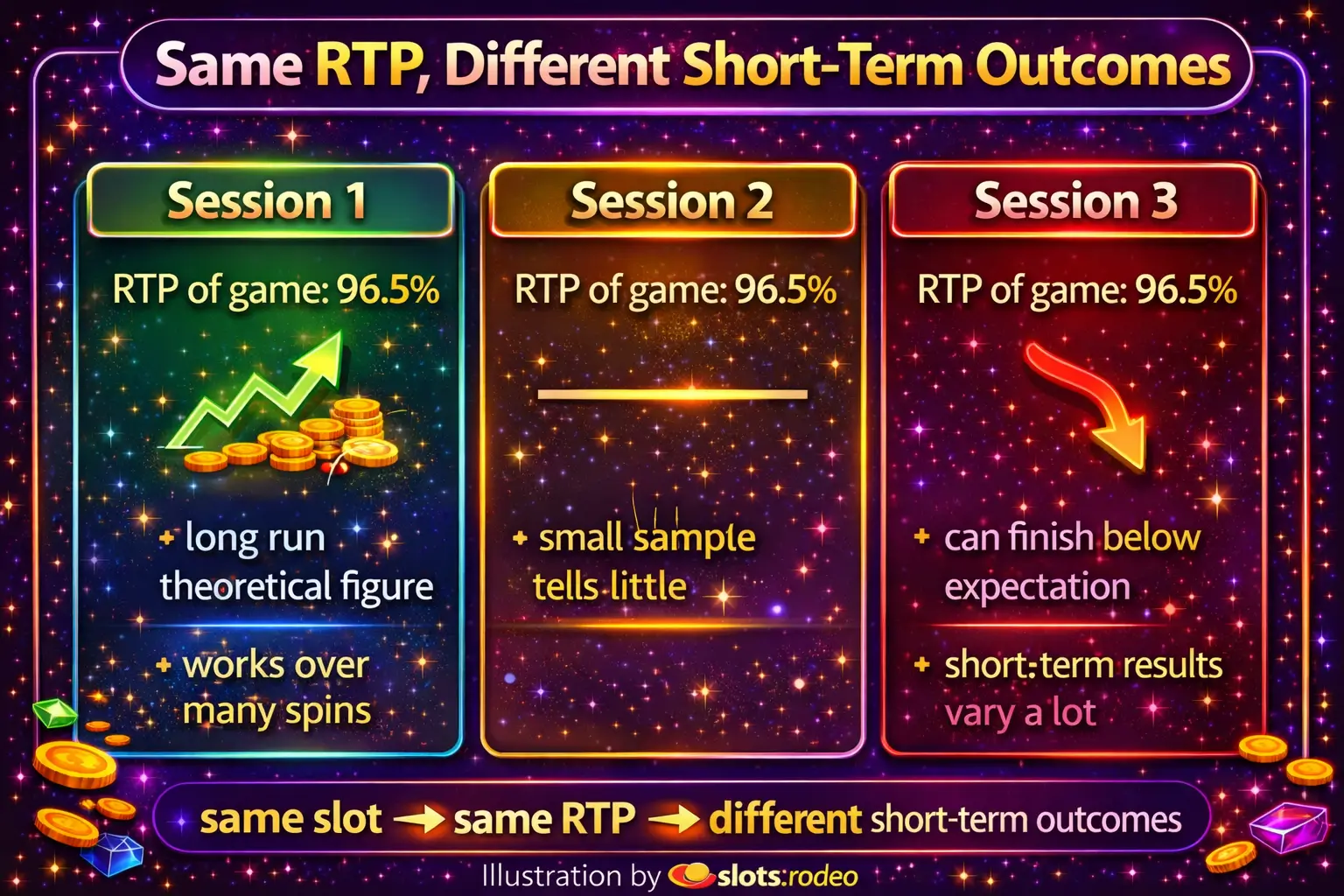 That is one of the most common misunderstandings around slots. A player sees 96.5% RTP and expects a "better" short session than on a game with 95.5% RTP. In reality, both sessions can end in completely different ways, and the higher-RTP game can still produce a poor short-term result.
