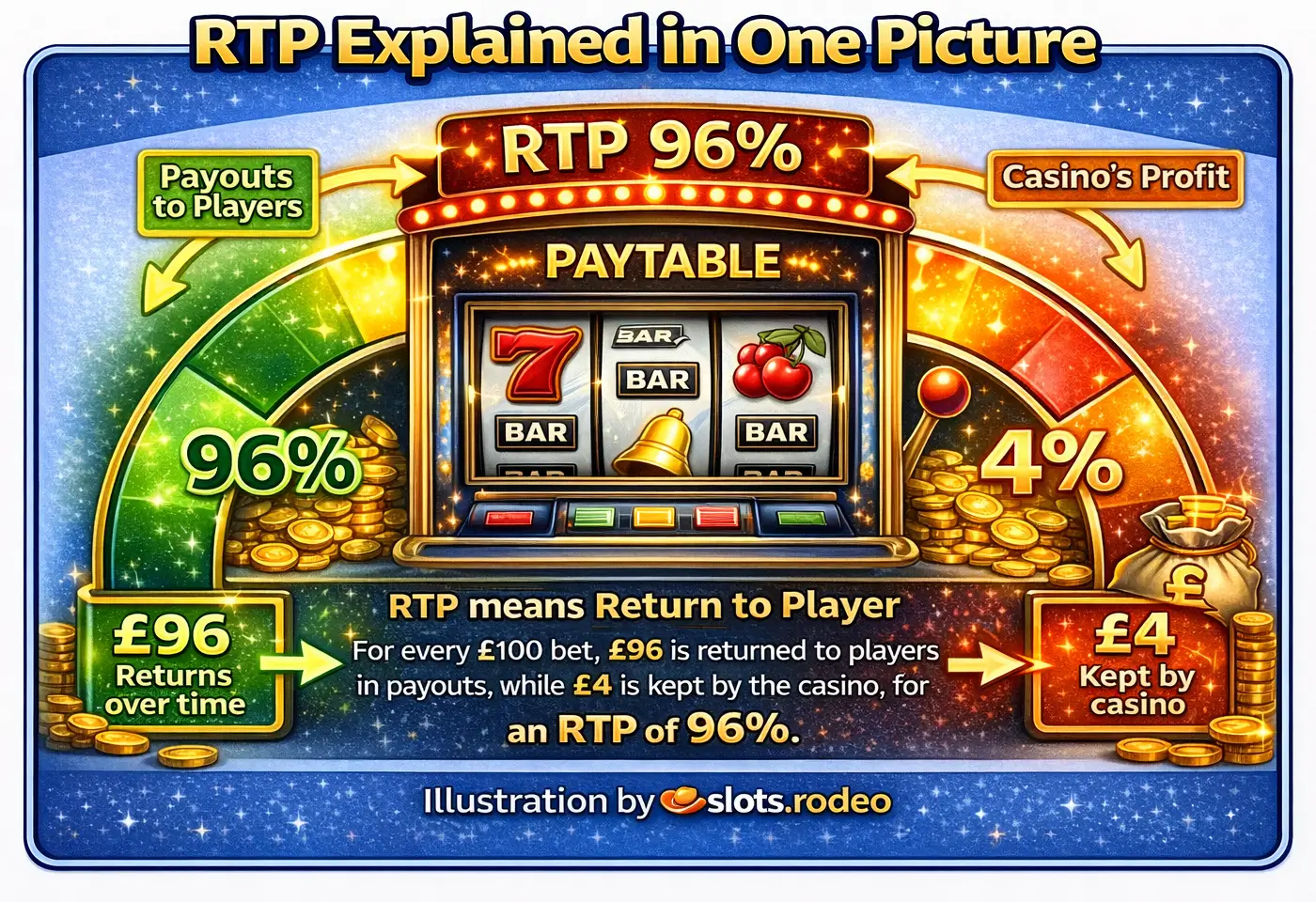 RTP (Return to Player)refers to the theoretical share of total stakes returned to playersover a significant number of spins.A slot with96% RTPis designed so that, in the long term, around 96% of the total wagered amount is returned to players, while the rest constitutes the house edge.