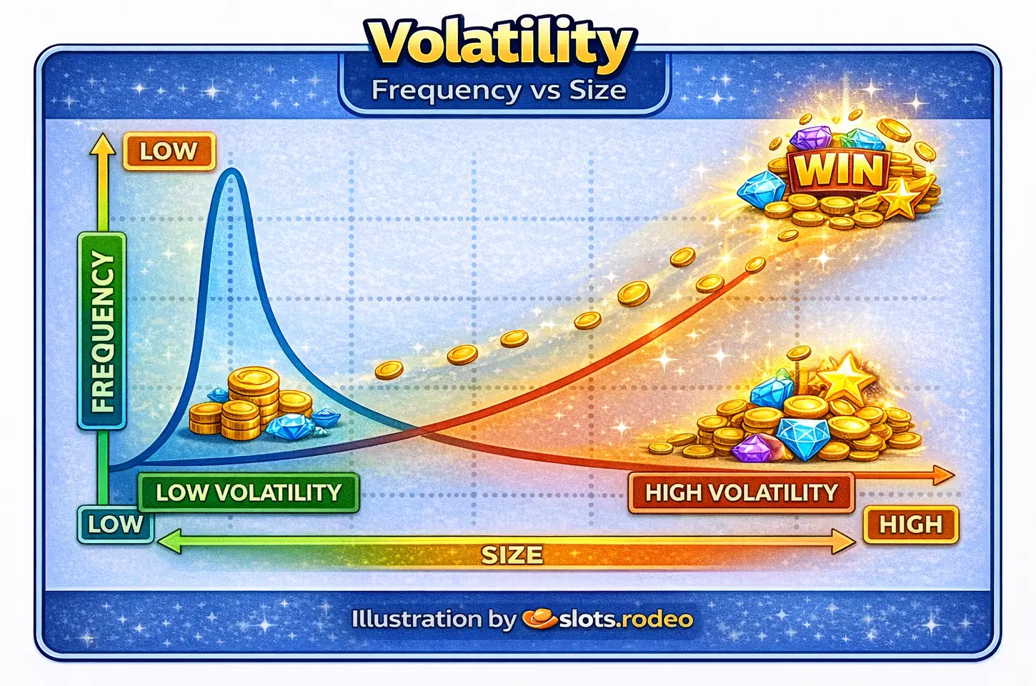 Volatility changes the "smoothness" of your balance over time, how often you see wins and features, and how likely a session is to include long dry spells or sharp swings. Volatility doesnotautomatically change RTP.
