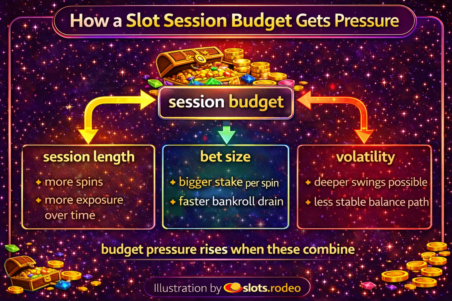 Diagram showing how bet size, session length, and slot volatility increase pressure on a session budget.
