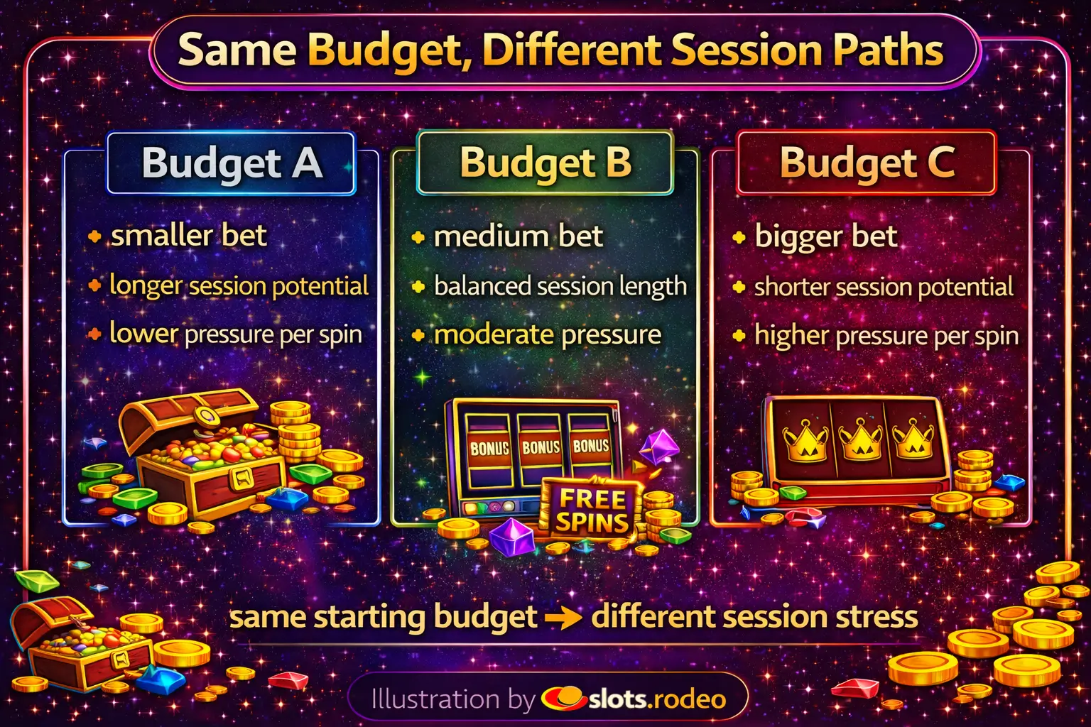 Illustration comparing how the same slot budget can lead to different session outcomes depending on bet size, volatility, and session length.